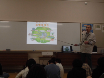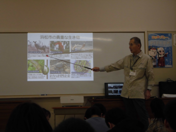 •  今日は浜松市環境政策課の先生をお迎えして、「生き物とわたしたちとのかかわり」についてお話を聞きました。生物多様性とは、私たちのくらしとの関わり、浜松市で目指している目標など、多くのことを教えていただきました。絶滅危惧種の話では、浜松市の中でも絶滅してしまった生き物がいること、絶滅してしまった理由には外来生物が関係していることなどを興味深く聞いていました。今日の学習で不思議に思ったこと、考えたこと、興味をもったことなどをこれからの学習に生かしていきたいと思います。