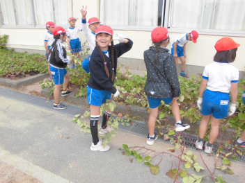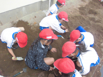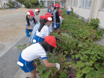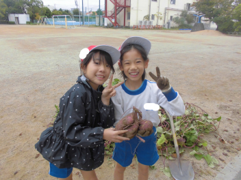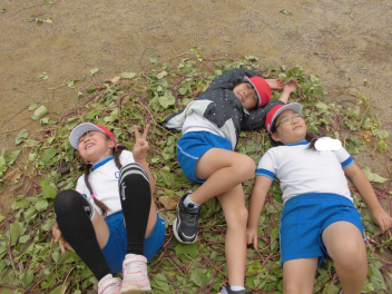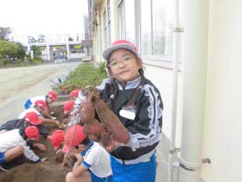 • 10月の最後の日、2年生はおいもほりをしました今年の春に、「大きくなあれ」と願いを込めて植えたさつまいもが、元気いっぱいに育ちました