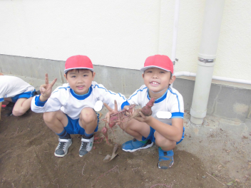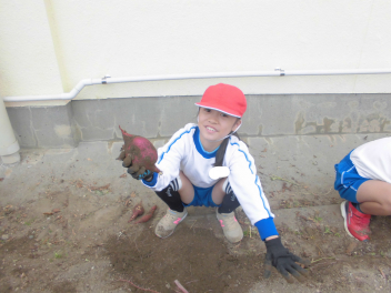 友達と力を合わせて、さつまいもを傷つけないように優しく土を掘り起こします「全然おいもが出てこないよ!」と言いながらも根気強く深く掘り進めて…無事に立派なさつまいもを収穫できました