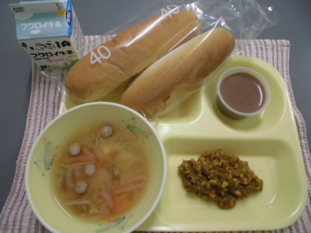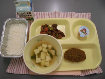 今日の給食は、ごはん・牛乳・黒はんぺんのお茶フライ・浜納豆煮・すまし汁・ミニみっかびみかんゼリーです