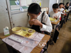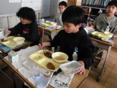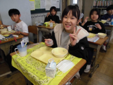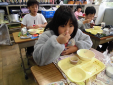 栄養教諭が5年生に実際に取った昆布とさばの削り節のだしがらを見せると、料理をおいしくするためのひと手間を感じたようで、すまし汁を味わって食べていました