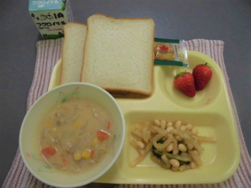 パン・牛乳・メープルジャム・コーンシチュー・大根と豆のサラダ・いちご