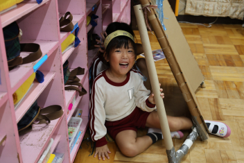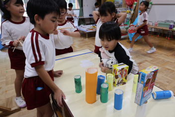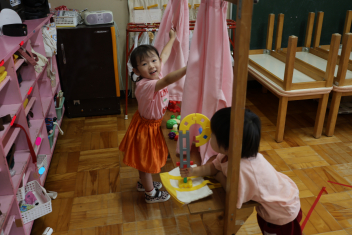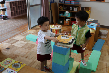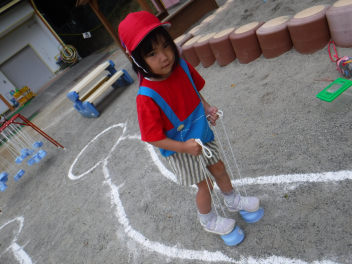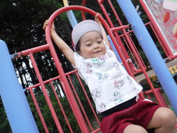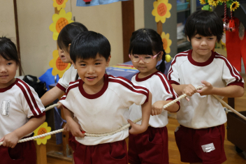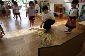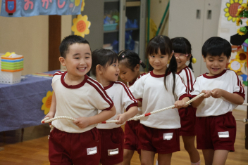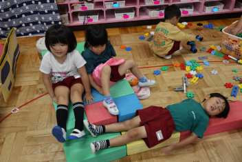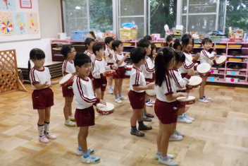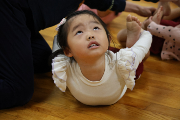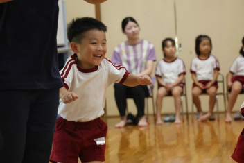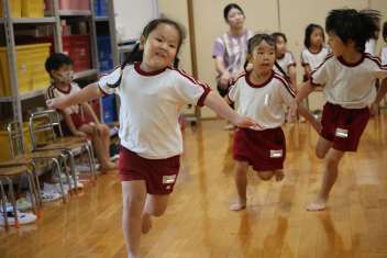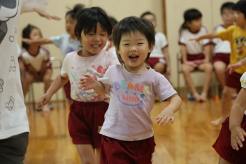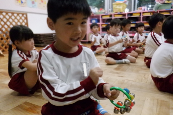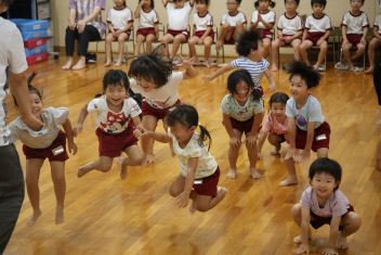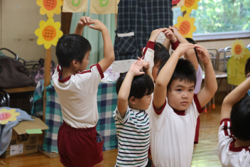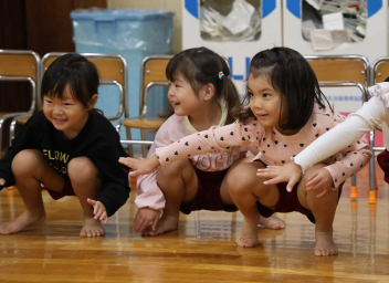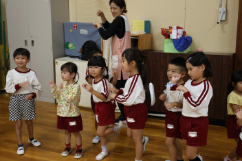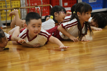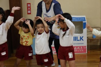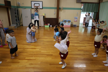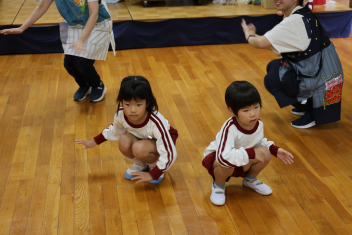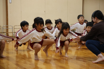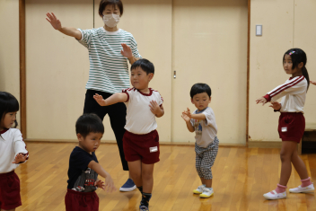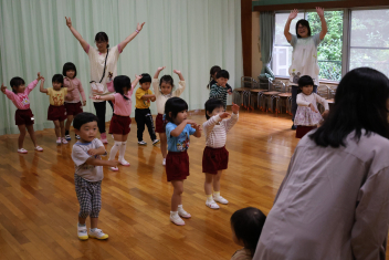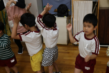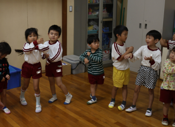 今日は朝からあいにく雨、肌寒い日になりました。でも、子供たちは元気です。遊戯室で新しい動きを取り入れられチャレンジしました。