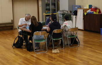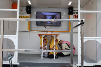 子供たちは、震度5弱の揺れを体験しました。実際の揺れとは違い、揺れること、揺れが収まることが分かっての体験でしたので、揺れの怖さはあまり感じなかったようです。先生方は震度7を体験しました。結構の揺れで、物が上から落ちてくるほどで机の脚をしっかり持っていないといられない状態で必死でした。その様子を目の当たりにしていた子供たちに緊張が走り、地震の怖さを少し感じたようでした。