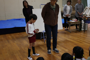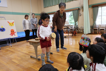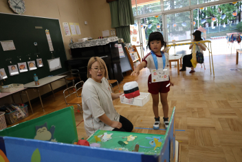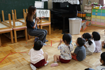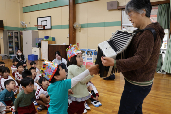 お楽しみは、「南風」さんに来ていただいて、楽器演奏、パネルシアター、楽器紹介などをしていただきました。アコーディオン、キーボードの演奏を交えて、歌ったり、いろいろな楽器を触らせてもらったりしました。子供たちは、進行の方の話し方、話術に完全に引き込まれ、身を乗り出し楽器を見たり、演奏を聴いたりしてとても楽しそうでした。先生方も飛び入り参加しました?