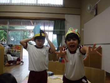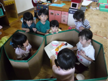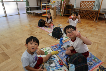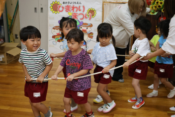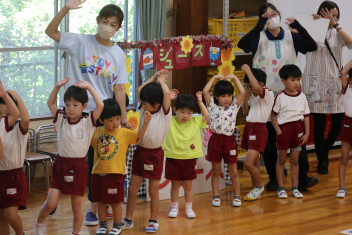 金曜日はひまわり祭りです。この日だけは晴れ予想です。外で神輿引きと盆踊りができることでしょう。盆踊りを遊戯室で練習しました。年長さんと年中さんは結構覚えていて踊っていました。