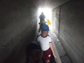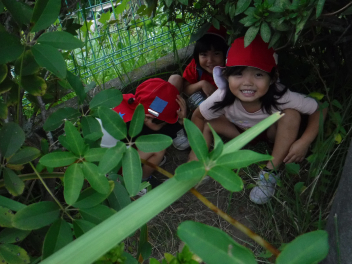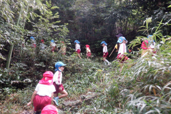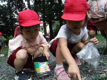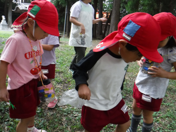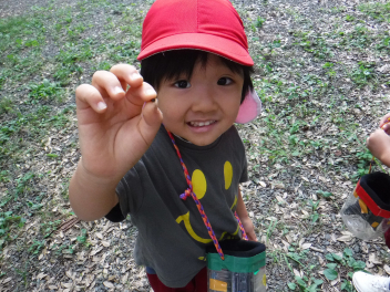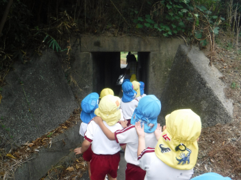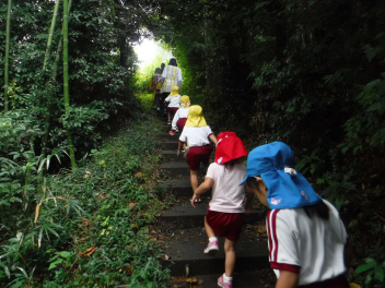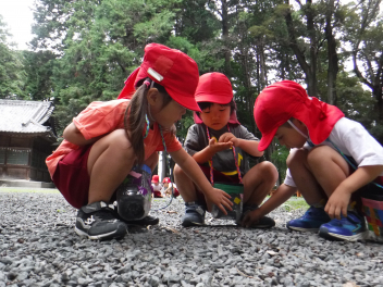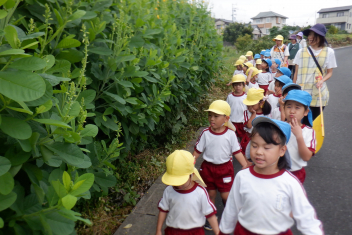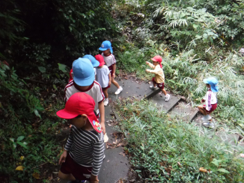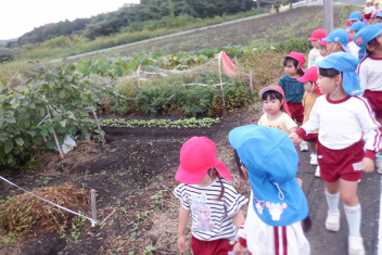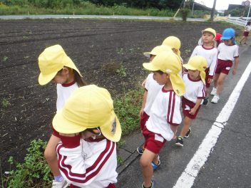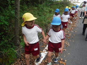 子供たちは、秋見つけに散歩に出掛けてきました。年中さんと年長さんは、まずは自称トンネルをくぐって、サツマイモ畑に行って育ち具合を見てきました。帰りは枯れ葉を踏みしめ、秋の木々を見付けて戻ってきました。年少さんは、2度目の神社境内で秋を見付けをしました。1回目よりコオロギがいっぱいいたようです。