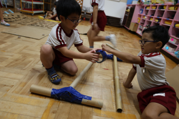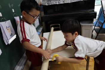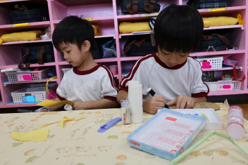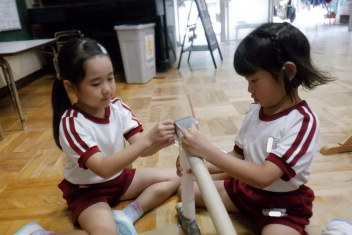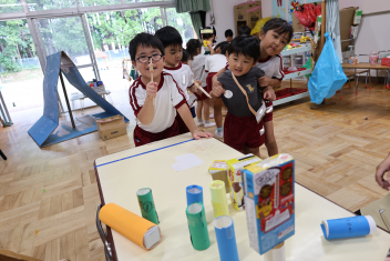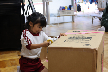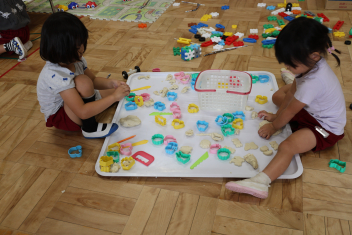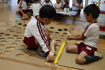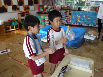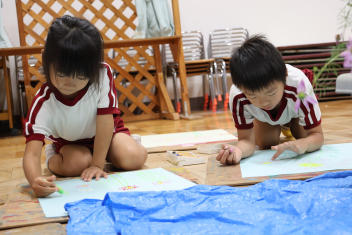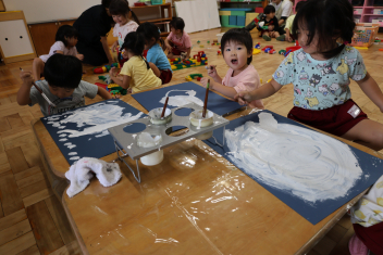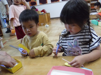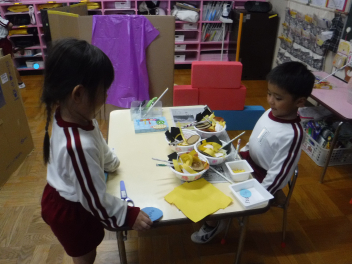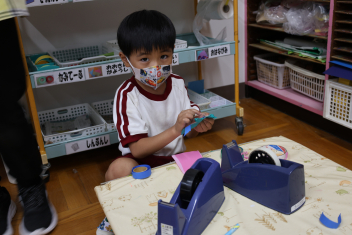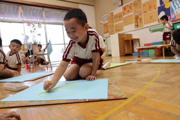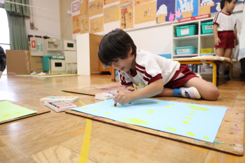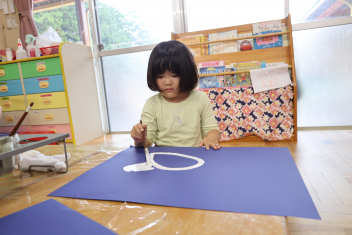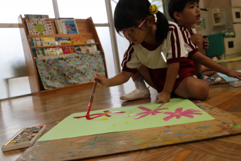 • 今日は朝からあいにくの雨(朝から降るとは思っていませんでした)のため、保育室で絵画製作に取り組みました。