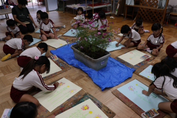 年中さんと年長さんは秋を象徴する花、コスモスの花に挑戦しました。