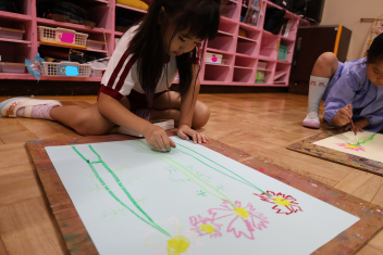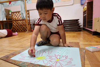 年中さんは、クレパスで中心の黄色い部分をかき、その周りを絵の具で赤やピンク、白の花びらをかき加えました。