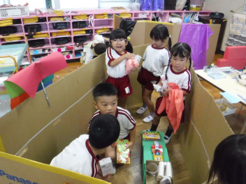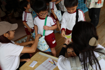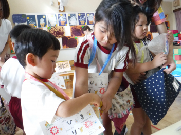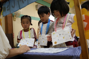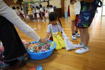 遊戯室で神輿担ぎを終えた後は、なかよしグループになって、出店を回りました。スタンプラリー形式でスタート!
