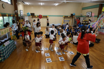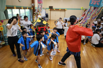 園庭のコンディションがあまりよくなかったので開会、盆踊り、神輿担ぎは遊戯室で行いました。