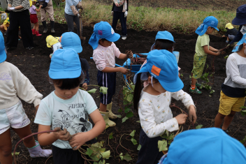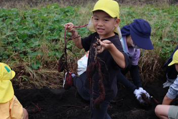年長さんは、つるを引っ張る芋掘りに挑戦しました。たくさんサツマイモができていたのでなかなか抜けず苦戦していました。年中さんも掘れど掘れど抜けず、時間がかかっていました。