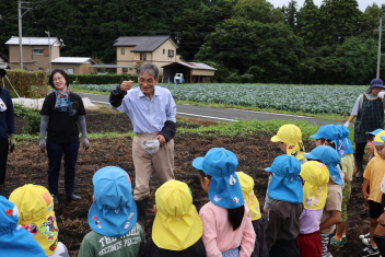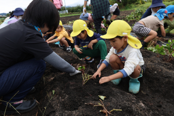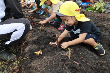 子供たちは、畑に着くと、地域の方、園芸サークルの方にあいさつをし、芋の掘り方を教わって芋掘りを始めました。