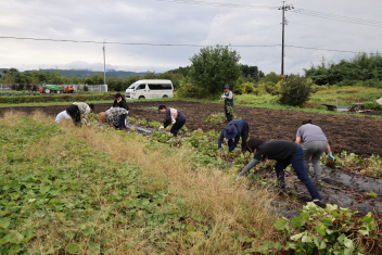 先発隊として、園芸サークルの方に協力をいただいて、子供たちが掘りやすいようにつるを切ったり、マルチを取り除いてもらいました。
