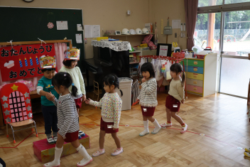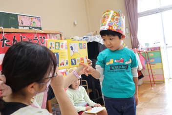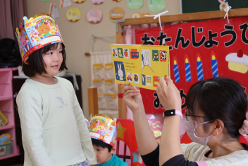 • 今日は11月生まれの誕生会でした。年少さん2人をみんなで歌ったり拍手をしたりしてお祝いしました。ママからのメッセージは、少し照れているのか緊張しているのかといった感じでしたが、ギュッとハグしてもらっている時は、最高の笑顔でした。