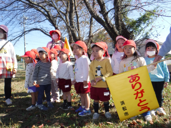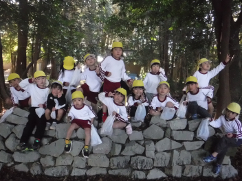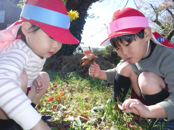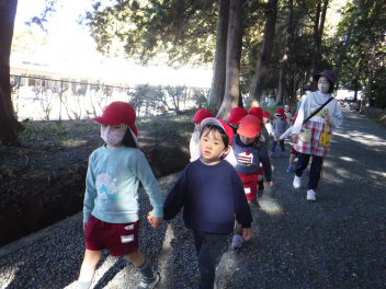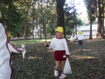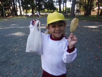 年中さんは、於呂神社に行って落ち葉を拾ってきました。この落ち葉は、生活発表会の劇に使われるそうです。