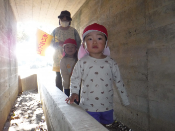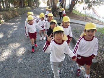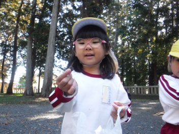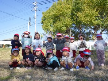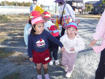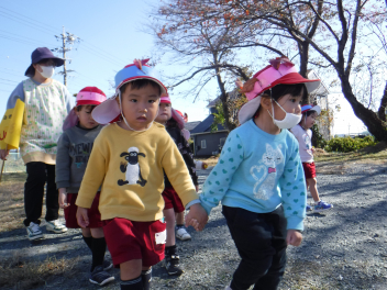 年少さんは、参道を通りトンネルを抜けて、畑のキャベツやミカン(子供たちは前回柿を見てきたので、オレンジ=柿と思いっている節があり、「柿、柿」と言っていたようです。)を見てきました。落ち葉のお面ベルトを作って戻ってきました。