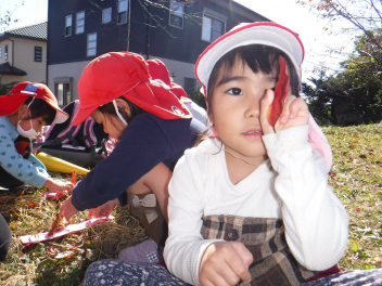 収穫以来、待ちわび楽しみにしていた催しでした。この日に都合を付けて来てくださったクッキングサークルの方が14名もいました。最強の助っ人の手を借り、火加減を調整しながら、おいしい焼き芋が焼き上がりました。(園の周りには枯れた杉葉がたくさんあり、すぐに取りに行けるのはとても良い環境です。)