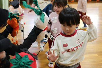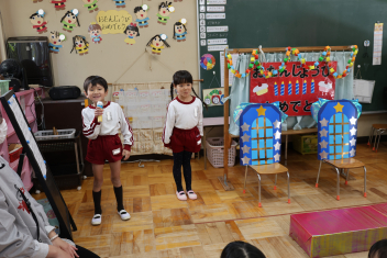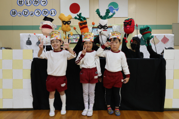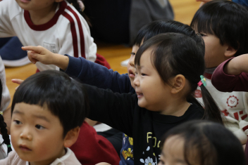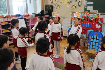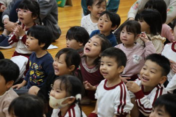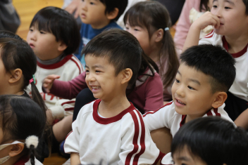 •  今日の一番の保育活動は、年長さんの生活発表会№9「さるかに合戦」のリハーサルでした。その様子を年中さんと年少さんが参観しました。年長さんはセリフをつなげ、最後まで劇を通すことができました。感想では、年少さんや年中さんから「かっこよかった」とか「たのしかった」とありました。生活発表会の演技が楽しみです。