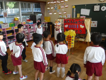 クラスのみんなでお祝いしました。サイコロを振って出た目の質問をしたり、友達から尋ねられたりして答えました。