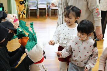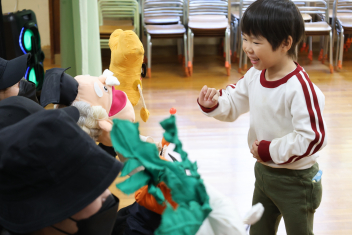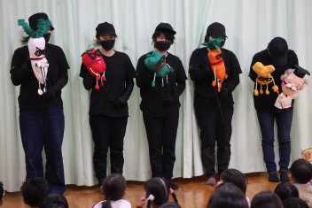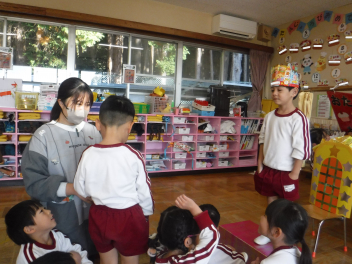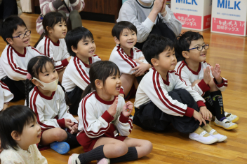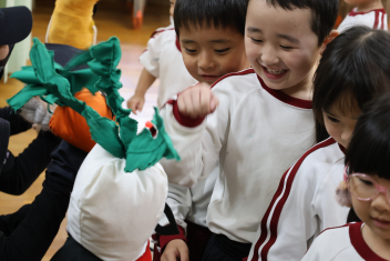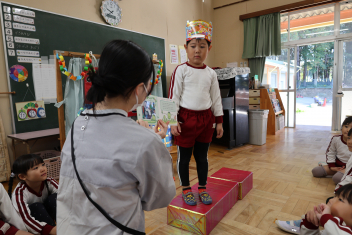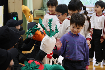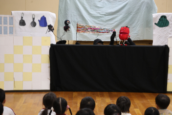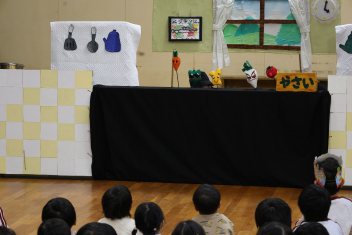お楽しみは、劇団こんぺいとうの皆さんに来ていただいて、「やさい ベジレンジャー」の人形劇を披露していただきました。病気に負けない丈夫で元気な体をつくるには、好き嫌いせず野菜を食べることが大事であることを教わりました。子供たちは楽しみながら学んでいました。いい顔がいっぱいでした。