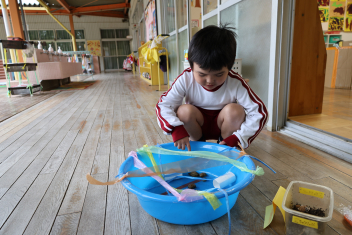 箱や画用紙を使って「虫」を作っている子がいました。最後は「虫」同士で戦いごっこが始まったようです。