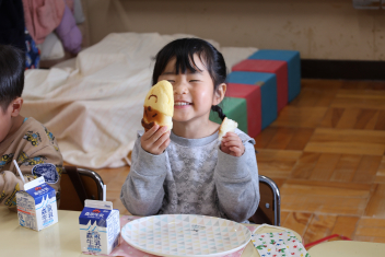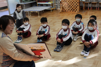 こぶたとおおかみの鬼ごっこをしたり、おうちごっこをしたりして簡単な言葉の掛け合いを楽しみながら遊んできたお話が劇遊びになりました。16匹のこぶたたちの歌やしぐさがかわいかったです。