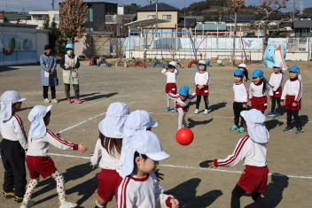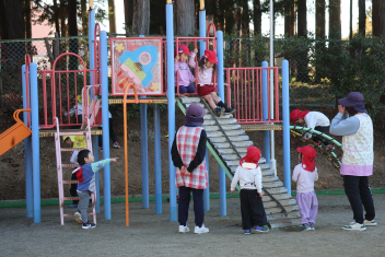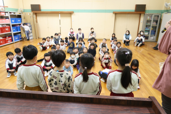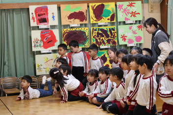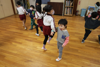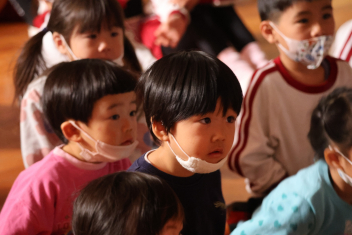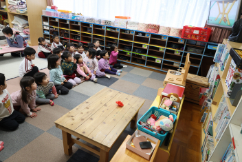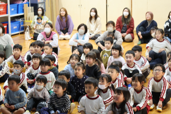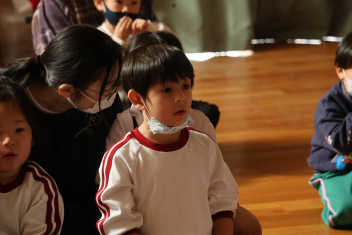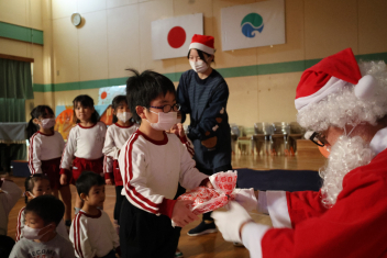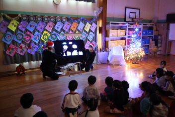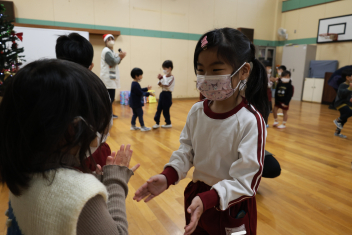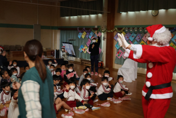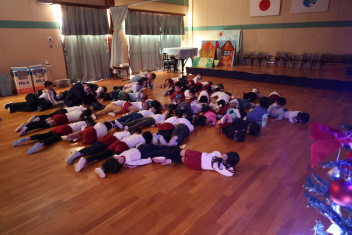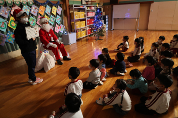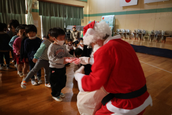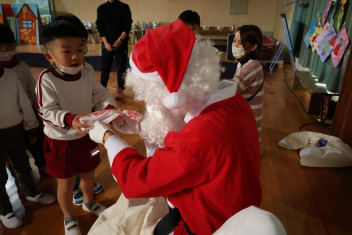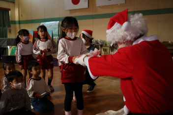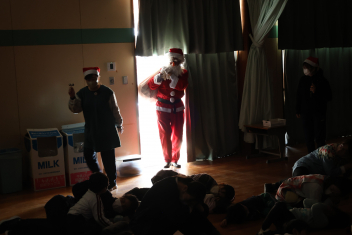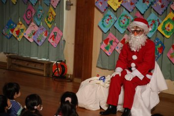 そして、いよいよ待ちに待ったサンタの登場です。床に伏せて、赤佐幼稚園にサンタさんが来るのを待ちました。ベルの音が響き扉が開き、プレゼントの袋を持ったサンタさんが現れました。(緊張していたのか、子供たちは意外と冷静でした!?)