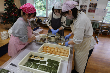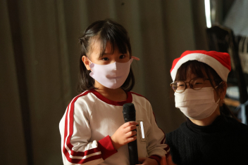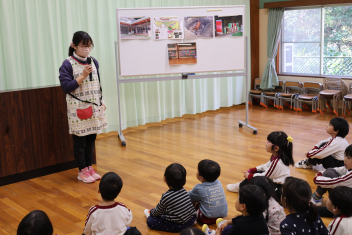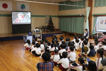 はじめに子供たちが作ったサンタからのプレゼントを入れる袋のアピールポイントを先生方が紹介しました。
