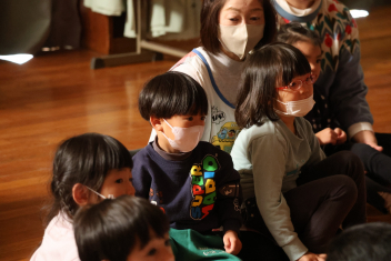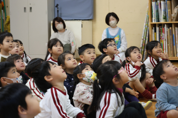 次に、ブラックシアターでイブに世界中の子供たちにプレゼントを届けるストーリーを紹介しました。電気を消し、暗い中で光るシートに目が奪われていました。