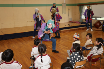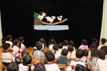 人形劇は「3びきのやぎのがらがらどん」でした。橋を渡ろうとするやぎを食べようとする「トロル」の声がお姉さんと思えぬ低い怖い感じの声だったので、子供たちに緊張が走りました。昨日の獅子の舞いに驚いて泣く子はいませんでした。