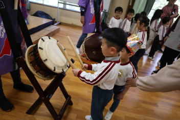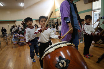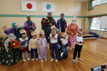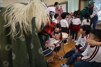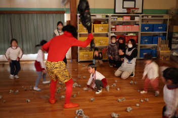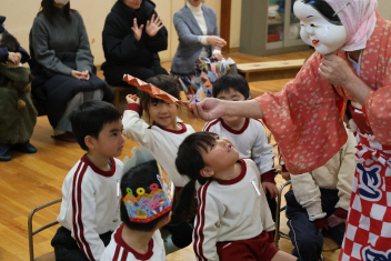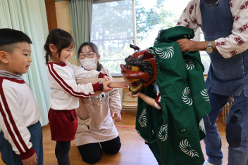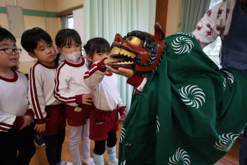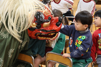 お楽しみは、有玉獅子舞保存会に方に来ていただいて、獅子を舞ってもらいました。太鼓を叩かせもらったり、獅子に噛んでもらっったりして大喜びでした。(ちょっと怖った子もいましたが・・・)おかめの扇子でいっぱい撫でてももらいました。鬼が来る前にみんないい子になったことでしょう!