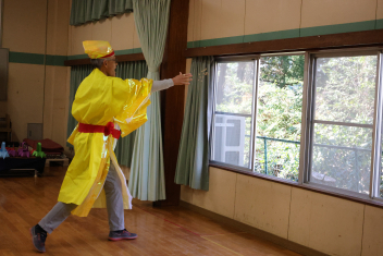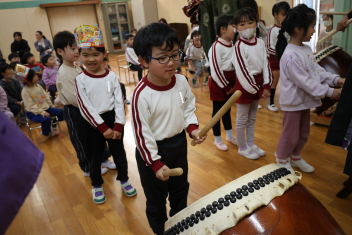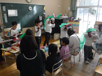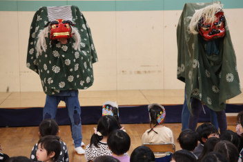 ・年中さんが、年長さんを招待して、たんぽぽ獅子舞保存会を結成して披露しました。すべて自分たちでつくった物です。