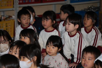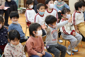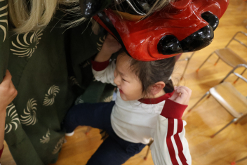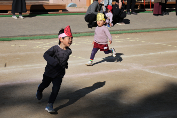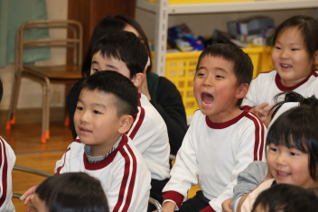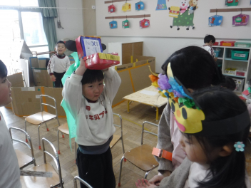 鬼が来た~~~!!!心の鬼退治をしている時に突然鬼が入ってきて、子供たちはパニック状態!年長さんは、果敢に鬼と対峙して向かっていきました。さすが!