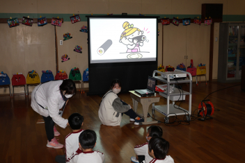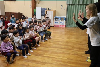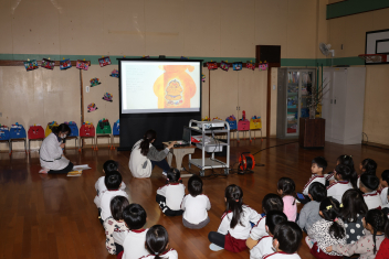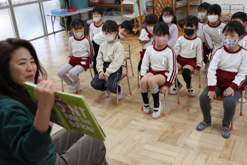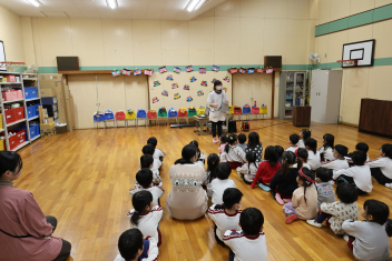 年長さんの読み聞かせ、こぐまちゃんがありました。「DON’T PUSH THE BUTTON!」という英語の絵本の読み聞かせでした。最初は子供たちに戸惑いが見られましたが、日本語で説明してもらうと納得!絵本の面白さが分かったようで楽しく聞くことができました。