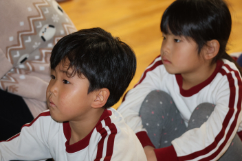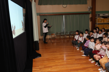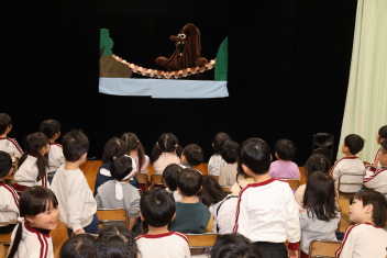 影絵は「さるかに合戦」でした。年長さんは、生活発表会で自分たちが発表した劇でもあったのでとても興味深く見ていました。
