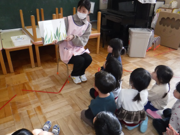 ・学生さんが1週間の観察実習に来ています。今日は、子供たちに読み聞かせをしました。(本人は大分緊張したようです)子供たちに「先生頑張れ!」という思いがあったのでしょう。よく聞いていました。