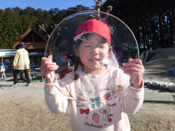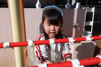 今日も氷が張りました。年中さんと年長さんは、氷に毛糸を通してペンダントを作りました。