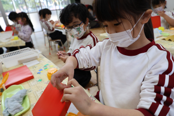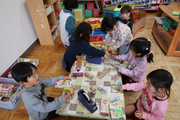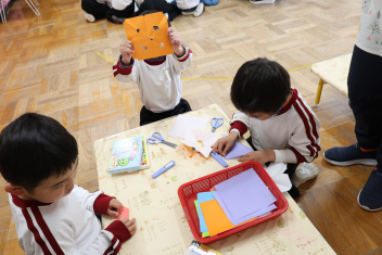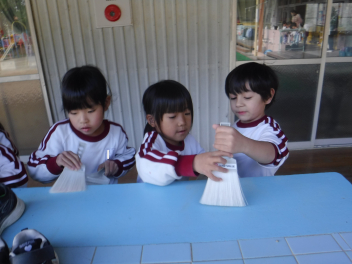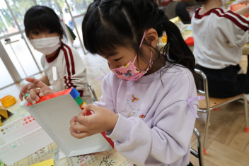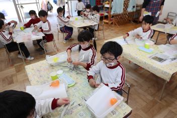 お別れ会も明後日に迫ってきました。年中組さんは、毎日練習したり、準備したりして頑張っています。今日は遊戯室の飾りものを作りました。