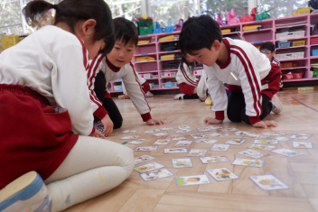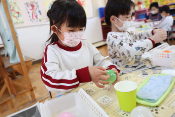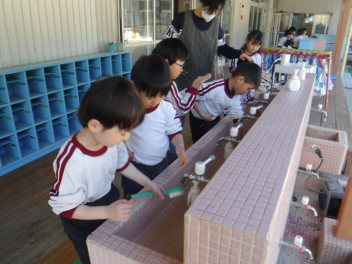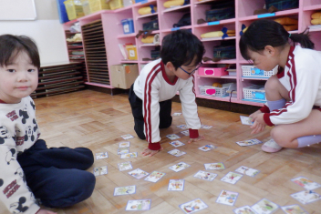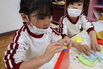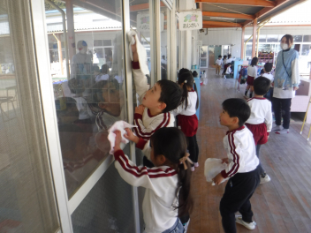 ・年中さんと年長さんの掃除の様子です。今、朝の欠席調べや掃除を一緒にやっています。年長さんが手本をみせて、年中さんに引き継いでいます。