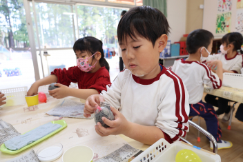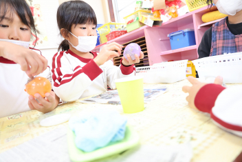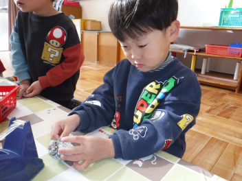 年長さんが雛人形づくりに取り掛かりました。水風船を土台に新聞紙や半紙を貼っていました。完成したら遊戯室に飾る予定です。