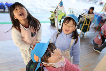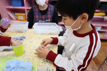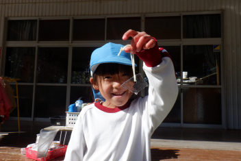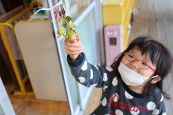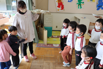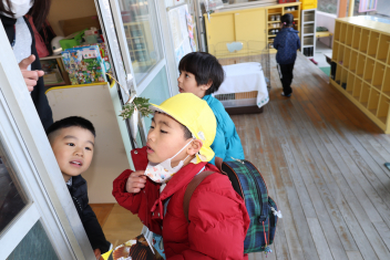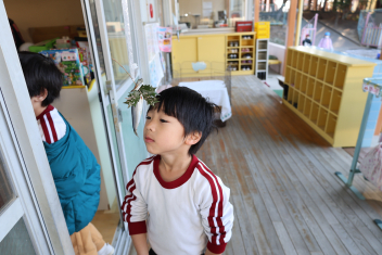 子供たちが登園すると、保育室前に柊鰯が吊してあり、興味津々に匂いをかいだり、思わず触ったりして、鼻や手についた臭いを嗅いでいました。