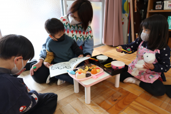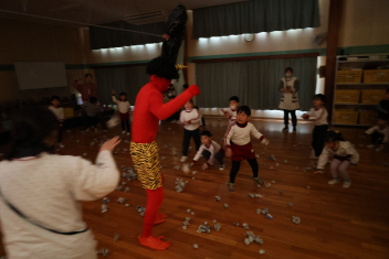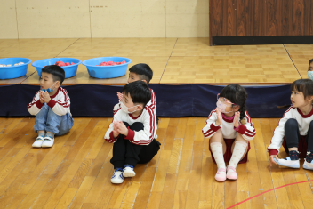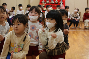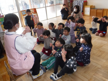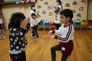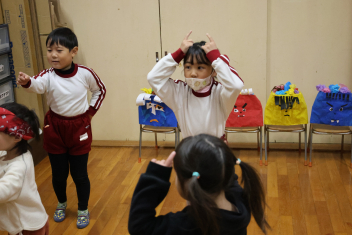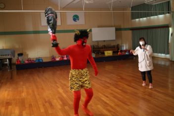 次に、「まめまき」の歌を歌ったり、「あかおに と あおおに のタンゴ」を踊って楽しみました。