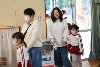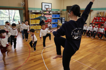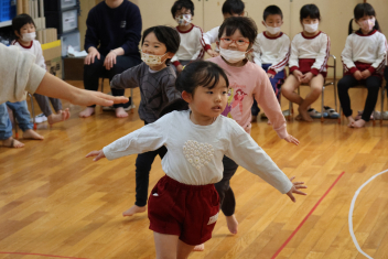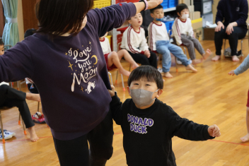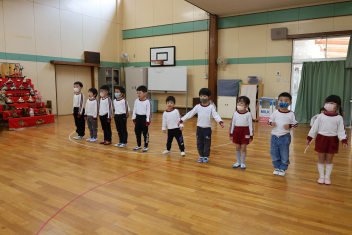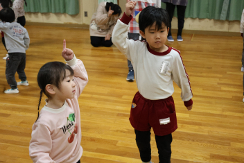 年長さんが、保育室や年中さんの時に踊ったことがあったので、前に出て手本を示して踊ってくれていました。