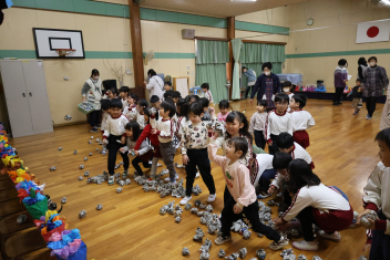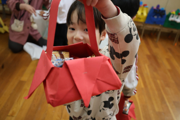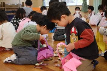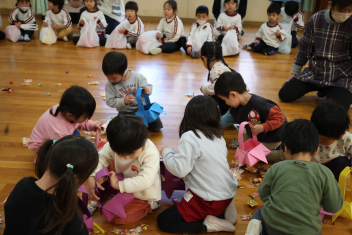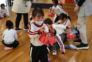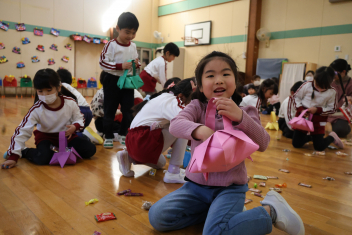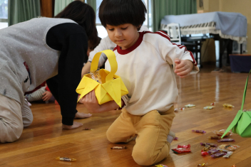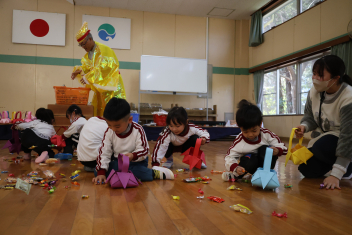 鬼を追い払った後に福の神が参上!「福は内」とたくさんのお菓子がまかれ、子供たちは大喜び!角香箱に入り切れないほど拾いました。鬼来て泣いていた子もすっかり笑顔!