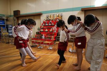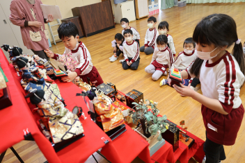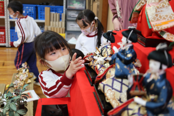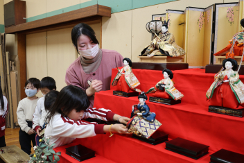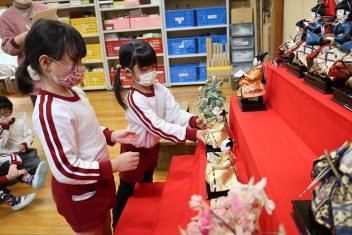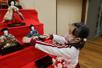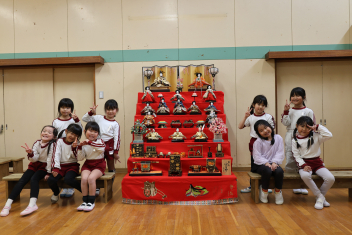年長さんが、3月3日の桃の節句を迎えるにあたって、昼食後に遊戯室に7段飾りの雛人形を飾ってくれました。落とさないように慎重に大事に持ってひな壇に飾りました。最後に女の子だけの記念撮影をしまいした。