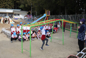 年長さんが、来週の参加会で披露するチャレンジ大会のリハーサルを年少さん年中さんに見せてくれました。チャレンジ種目はなわとび、こま回し、竹馬、雲梯等でした。