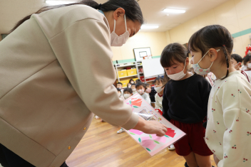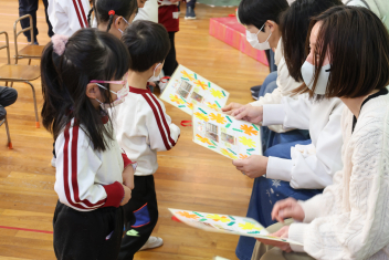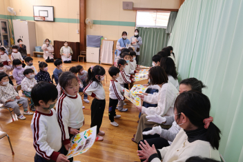 続いて、お礼に年少さんと年中さんは、にこにこマームバンドの方やなかよしおばさんに感謝の気持ちを込めて「ありがとうカード」(年長さんは、配達最終日に牛乳屋さん、パン屋さん、かえる弁当屋さんにカードを渡します。)を贈り、みんなで「ドレミの歌」を合唱しました。