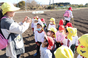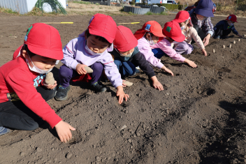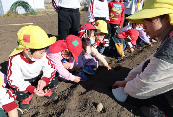 • 年少さんと年中さんが、地域の方からお借りしている畑にジャガイモの種イモを植えてきました。
